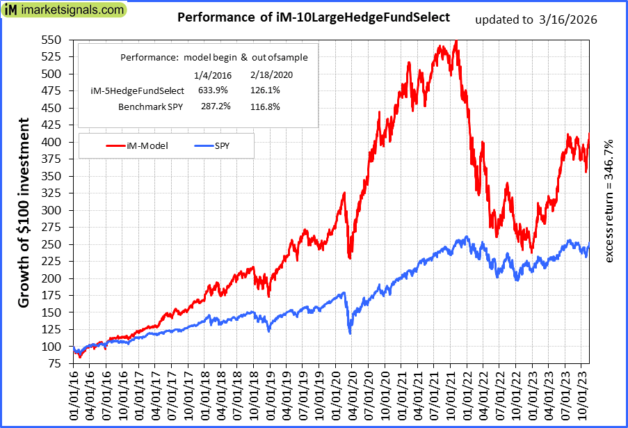 iM-10LargeHedgeFundSelect: Since inception, on 1/5/2016, the model gained 633.93% while the benchmark SPY gained 287.20% over the same period. Over the previous week the market value of iM-10LargeHedgeFundSelect gained -1.96% at a time when SPY gained -1.36%. A starting capital of $25,000 at inception on 1/5/2016 would have grown to $183,482 which includes $210 cash and excludes $1,951 spent on fees and slippage. |
