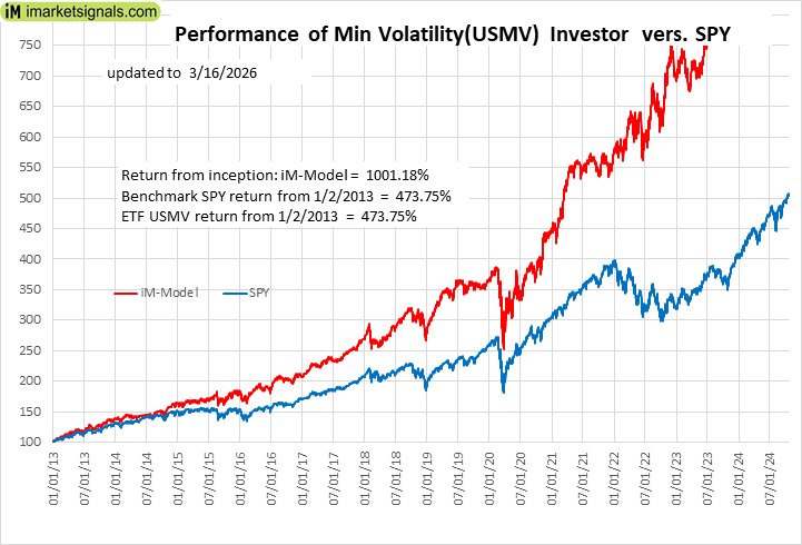 iM-Min Volatility(USMV) Investor (Tax Efficient): The model’s out of sample performance YTD is -7.5%, and for the last 12 months is 11.0%. Over the same period the benchmark SPY performance was -1.9% and 20.3% respectively. Since inception, on 1/3/2013, the model gained 1001.18% while the benchmark SPY gained 473.75% and the ETF USMV gained 473.75% over the same period. Over the previous week the market value of iM-Best12(USMV)Q1 gained -4.85% at a time when SPY gained -1.36%. A starting capital of $100,000 at inception on 1/3/2013 would have grown to $1,101,180 which includes $813 cash and excludes $15,356 spent on fees and slippage. |