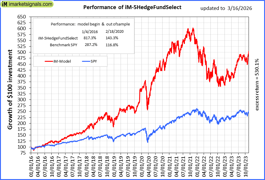 iM-5HedgeFundSelect: Since inception, on 1/5/2016, the model gained 817.34% while the benchmark SPY gained 287.20% over the same period. Over the previous week the market value of iM-5HedgeFundSelect gained -2.94% at a time when SPY gained -1.36%. A starting capital of $25,000 at inception on 1/5/2016 would have grown to $229,336 which includes $15,215 cash and excludes $3,216 spent on fees and slippage. |