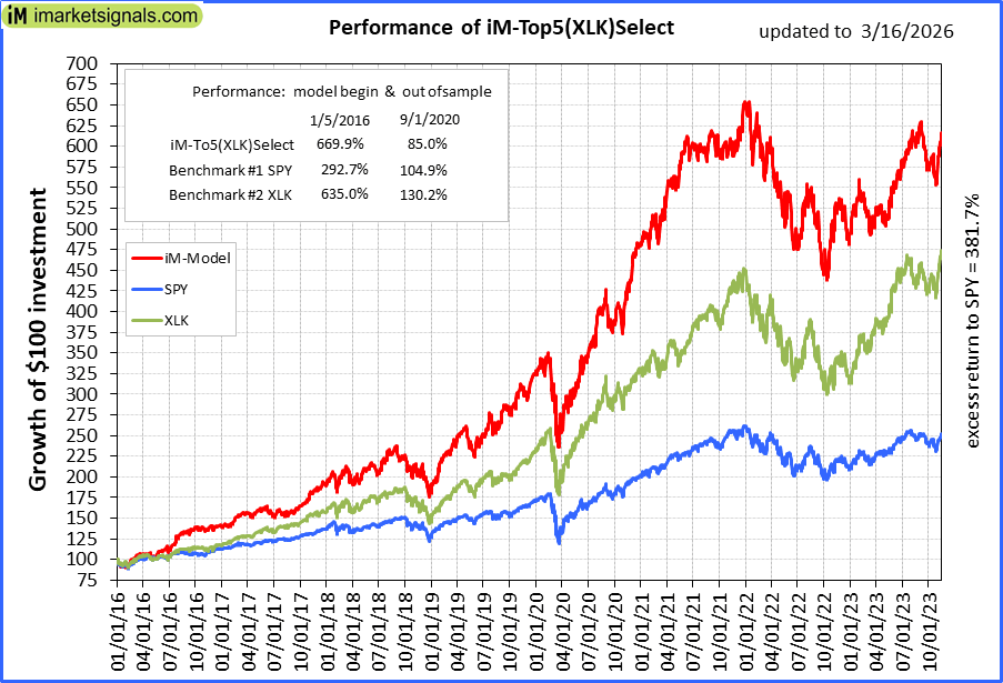 iM-Top5(XLK)Select: Since inception, on 1/5/2016, the model gained 668.88% while the benchmark SPY gained 287.20% over the same period. Over the previous week the market value of iM-Top5(XLK)Select gained -3.35% at a time when SPY gained -1.36%. A starting capital of $100,000 at inception on 1/5/2016 would have grown to $768,881 which includes $5,136 cash and excludes $3,071 spent on fees and slippage. |