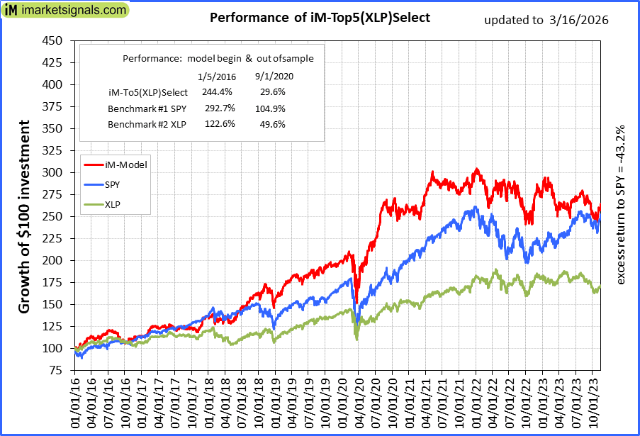 iM-Top5(XLP)Select: Since inception, on 1/5/2016, the model gained 243.98% while the benchmark SPY gained 287.20% over the same period. Over the previous week the market value of iM-Top5(XLP)Select gained -4.48% at a time when SPY gained -1.36%. A starting capital of $100,000 at inception on 1/5/2016 would have grown to $343,984 which includes $2,580 cash and excludes $3,099 spent on fees and slippage. |