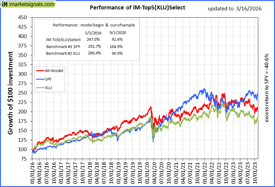iM-Top5(XLU)Select: Since inception, on 1/5/2016, the model gained 246.56% while the benchmark SPY gained 287.20% over the same period. Over the previous week the market value of iM-Top5(XLU)Select gained 1.50% at a time when SPY gained -1.36%. A starting capital of $100,000 at inception on 1/5/2016 would have grown to $346,565 which includes $1,381 cash and excludes $18,540 spent on fees and slippage. |