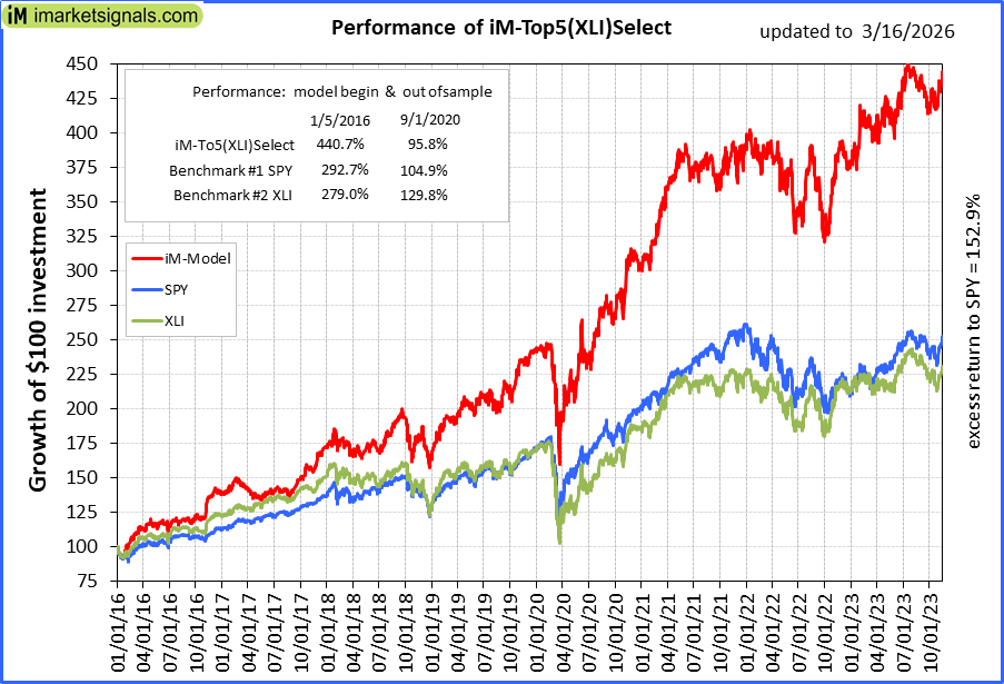 iM-Top5(XLI)Select: Since inception, on 1/5/2016, the model gained 440.07% while the benchmark SPY gained 287.20% over the same period. Over the previous week the market value of iM-Top5(XLI)Select gained -2.83% at a time when SPY gained -1.36%. A starting capital of $100,000 at inception on 1/5/2016 would have grown to $540,072 which includes $2,179 cash and excludes $8,921 spent on fees and slippage. |