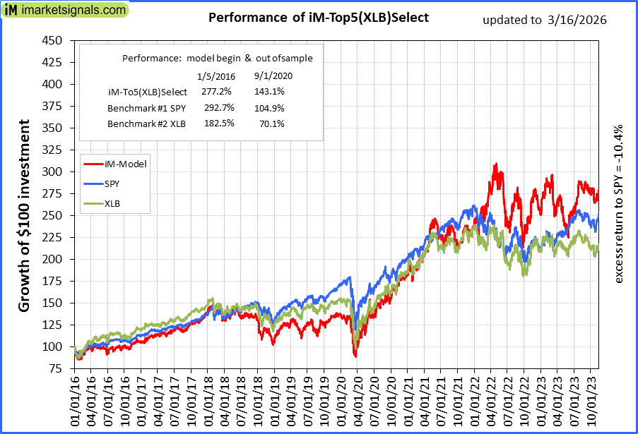 iM-Top5(XLB)Select: Since inception, on 1/5/2016, the model gained 276.81% while the benchmark SPY gained 287.20% over the same period. Over the previous week the market value of iM-Top5(XLB)Select gained 0.15% at a time when SPY gained -1.36%. A starting capital of $100,000 at inception on 1/5/2016 would have grown to $376,807 which includes -$3,348 cash and excludes $17,524 spent on fees and slippage. |