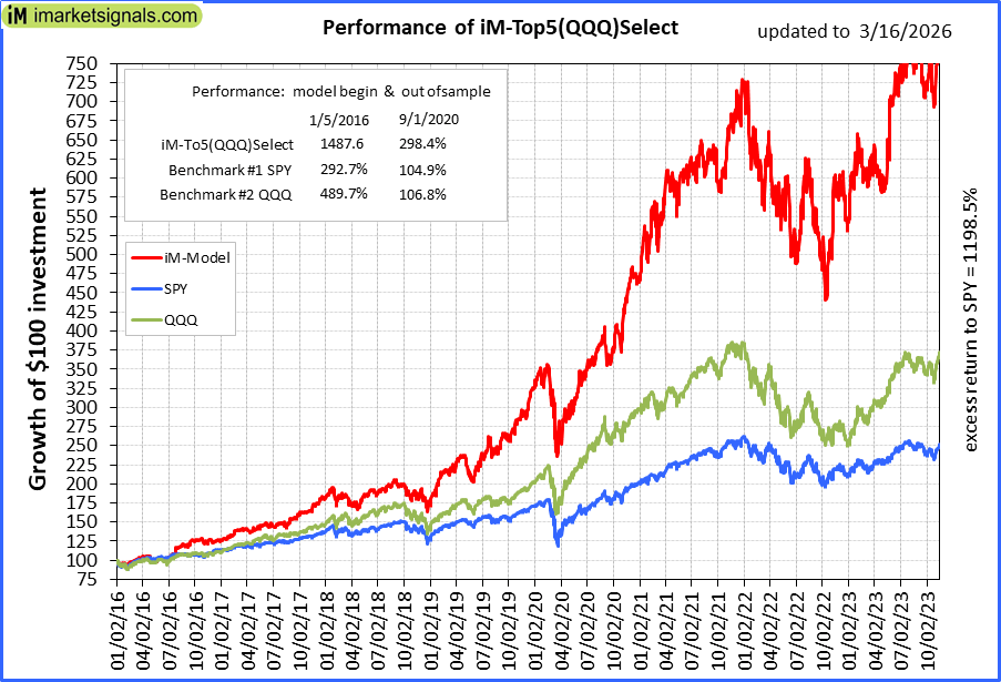 iM-Top5(QQQ)Select: Since inception, on 1/5/2016, the model gained 1485.73% while the benchmark SPY gained 287.20% over the same period. Over the previous week the market value of iM-Top5(QQQ)Select gained -4.68% at a time when SPY gained -1.36%. A starting capital of $100,000 at inception on 1/5/2016 would have grown to $1,585,735 which includes -$13,164 cash and excludes $27,015 spent on fees and slippage. |
