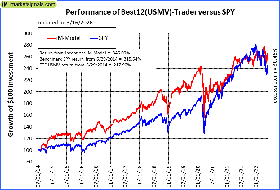 iM-Best12(USMV)-Trader: The model’s out of sample performance YTD is 4.4%, and for the last 12 months is 26.2%. Over the same period the benchmark SPY performance was -1.9% and 20.3% respectively. Since inception, on 6/30/2014, the model gained 346.09% while the benchmark SPY gained 315.64% and the ETF USMV gained 217.90% over the same period. Over the previous week the market value of iM-Best12(USMV)-Trader gained -0.70% at a time when SPY gained -1.36%. A starting capital of $100,000 at inception on 6/30/2014 would have grown to $446,095 which includes $1,998 cash and excludes $8,774 spent on fees and slippage. |