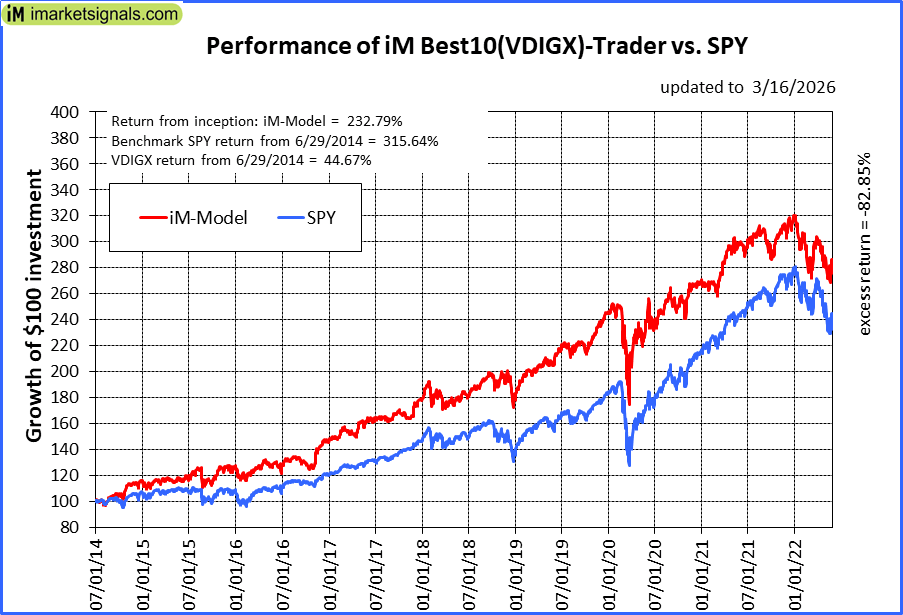 iM-Best10(VDIGX)-Trader: The model’s out of sample performance YTD is -10.7%, and for the last 12 months is -3.5%. Over the same period the benchmark SPY performance was -1.9% and 20.3% respectively. Since inception, on 7/1/2014, the model gained 232.79% while the benchmark SPY gained 315.64% and VDIGX gained 44.67% over the same period. Over the previous week the market value of iM-Best10(VDIGX) gained -2.72% at a time when SPY gained -1.36%. A starting capital of $100,000 at inception on 7/1/2014 would have grown to $332,786 which includes $466 cash and excludes $5,704 spent on fees and slippage. |
