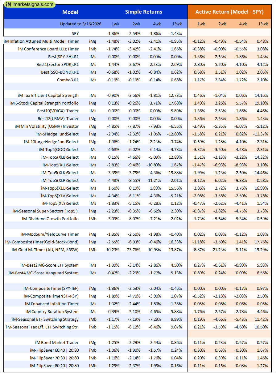 iM-Composite (SPY-IEF) Timer: The model’s out of sample performance YTD is -0.7%, and for the last 12 months is 5.1%. Over the same period the benchmark SPY performance was -1.9% and 20.3% respectively. Over the previous week the market value of the iM-Composite (SPY-IEF) Timer gained -1.36% at a time when SPY gained -1.36%. A starting capital of $100,000 at inception on 6/30/2016 would have grown to $215,121 which includes $362 cash and excludes $8,651 spent on fees and slippage. |