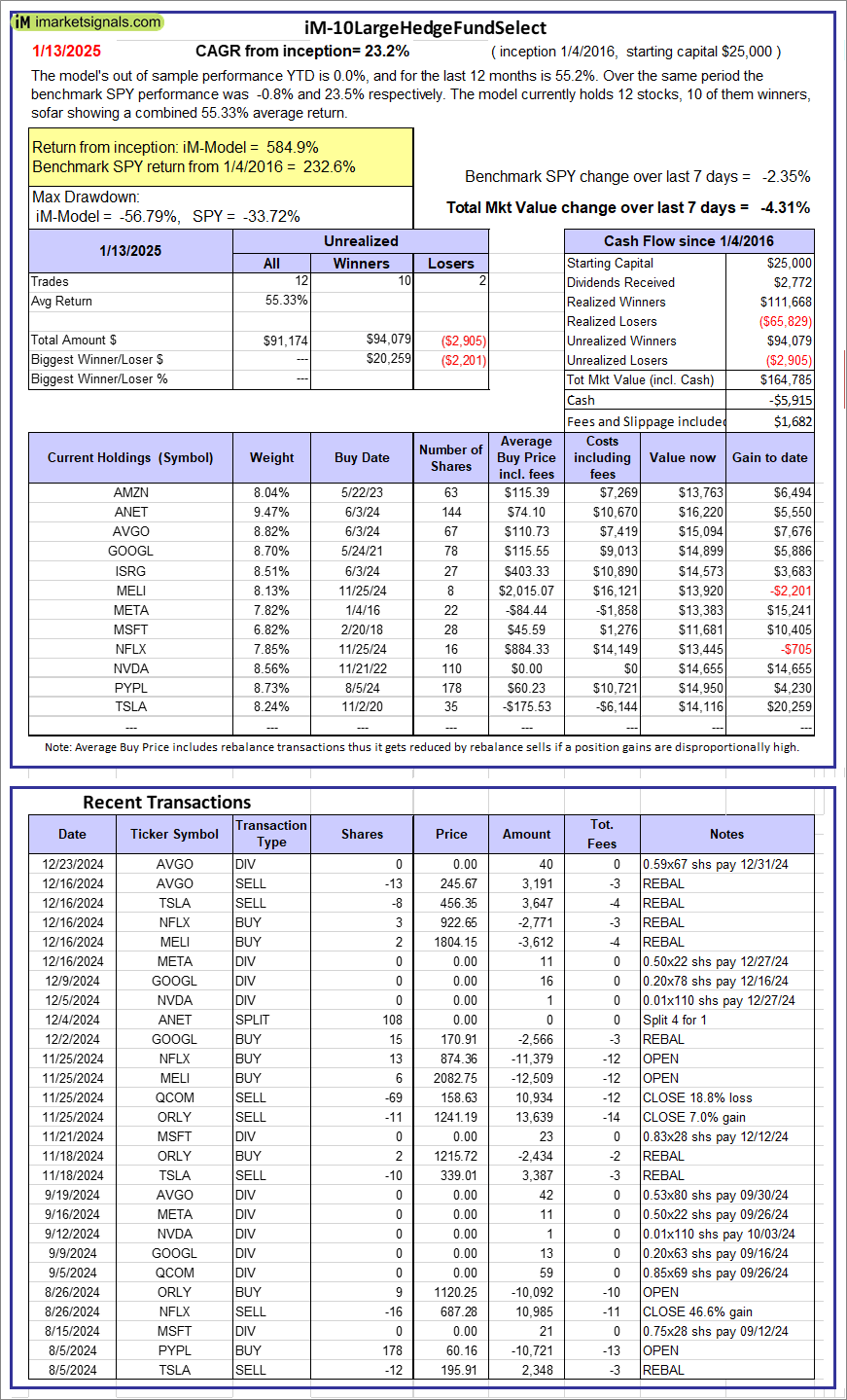 iM-10LargeHedgeFundSelect: Since inception, on 1/5/2016, the model gained 584.93% while the benchmark SPY gained 232.57% over the same period. Over the previous week the market value of iM-10LargeHedgeFundSelect gained -4.31% at a time when SPY gained -2.35%. A starting capital of $25,000 at inception on 1/5/2016 would have grown to $164,785 which includes -$5,915 cash and excludes $1,682 spent on fees and slippage. |