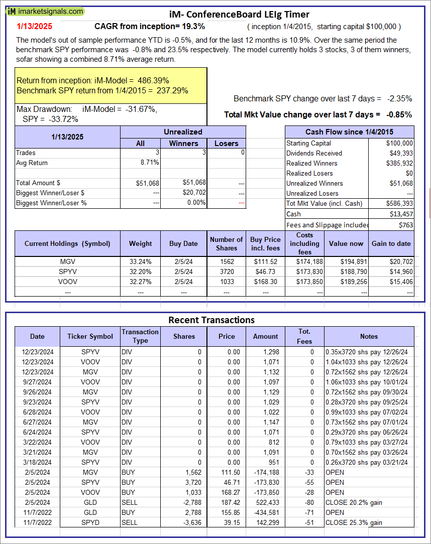 iM-Conference Board LEIg Timer: The model’s performance YTD is 14.3%, and for the last 12 months is 7.3%. Over the same period the benchmark SPY performance was 20.1% and 9.4% respectively. Over the previous week the market value of the iM-Conference Board LEIg Timer gained -0.85% at a time when SPY gained -2.35%. A starting capital of $100,000 at inception on 4/5/2017 would have grown to $586,393 which includes $13,457 cash and excludes $763 spent on fees and slippage. |