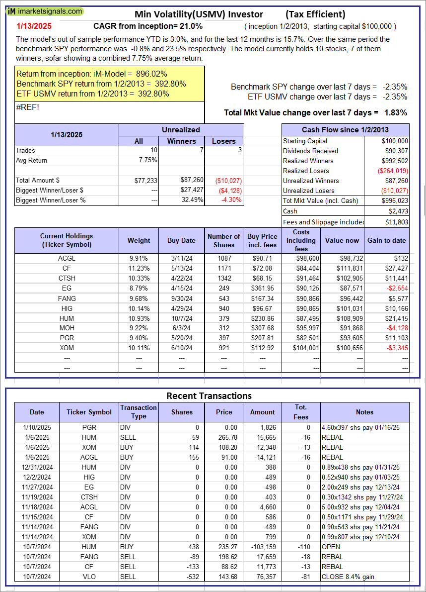 iM-Min Volatility(USMV) Investor (Tax Efficient): The model’s out of sample performance YTD is 3.0%, and for the last 12 months is 15.7%. Over the same period the benchmark SPY performance was -0.8% and 23.5% respectively. Since inception, on 1/3/2013, the model gained 896.02% while the benchmark SPY gained 392.80% and the ETF USMV gained 392.80% over the same period. Over the previous week the market value of iM-Best12(USMV)Q1 gained 1.83% at a time when SPY gained -2.35%. A starting capital of $100,000 at inception on 1/3/2013 would have grown to $996,023 which includes $2,473 cash and excludes $11,803 spent on fees and slippage. |