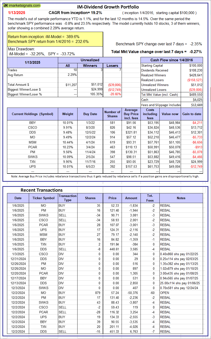 iM-Dividend Growth Portfolio: The model’s out of sample performance YTD is 1.1%, and for the last 12 months is 14.5%. Over the same period the benchmark SPY performance was -0.8% and 23.5% respectively. Over the previous week the market value of the iM-Dividend Growth Portfolio gained -0.27% at a time when SPY gained -2.35%. A starting capital of $100,000 at inception on 6/30/2016 would have grown to $489,550 which includes $4,025 cash and excludes $12,669 spent on fees and slippage. |