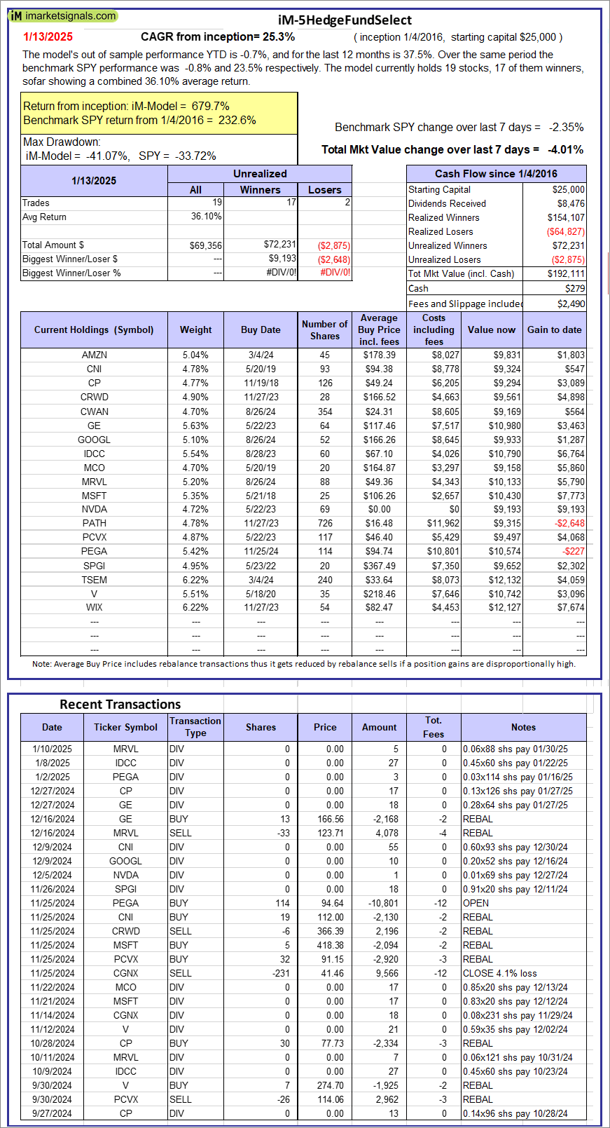 iM-5HedgeFundSelect: Since inception, on 1/5/2016, the model gained 679.74% while the benchmark SPY gained 232.57% over the same period. Over the previous week the market value of iM-5HedgeFundSelect gained -4.01% at a time when SPY gained -2.35%. A starting capital of $25,000 at inception on 1/5/2016 would have grown to $192,111 which includes $279 cash and excludes $2,490 spent on fees and slippage. |