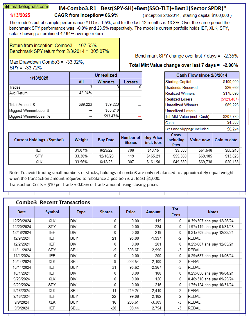 iM-Combo3.R1: The model’s out of sample performance YTD is -1.5%, and for the last 12 months is 13.8%. Over the same period the benchmark SPY performance was -0.8% and 23.5% respectively. Over the previous week the market value of iM-Combo3.R1 gained -2.80% at a time when SPY gained -2.35%. A starting capital of $100,000 at inception on 2/3/2014 would have grown to $207,780 which includes $4,308 cash and excludes $8,274 spent on fees and slippage. |