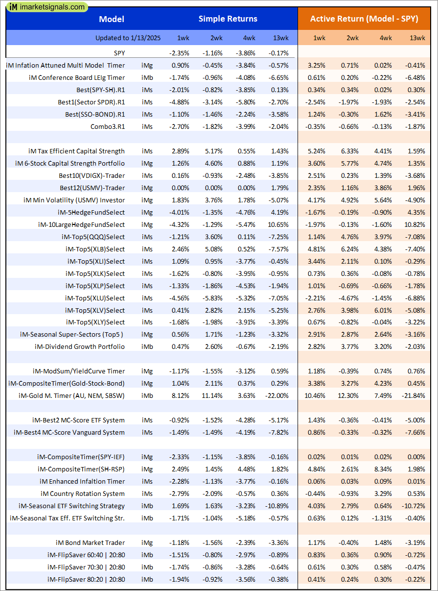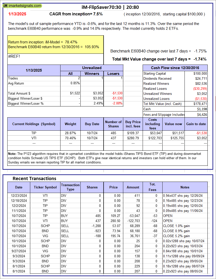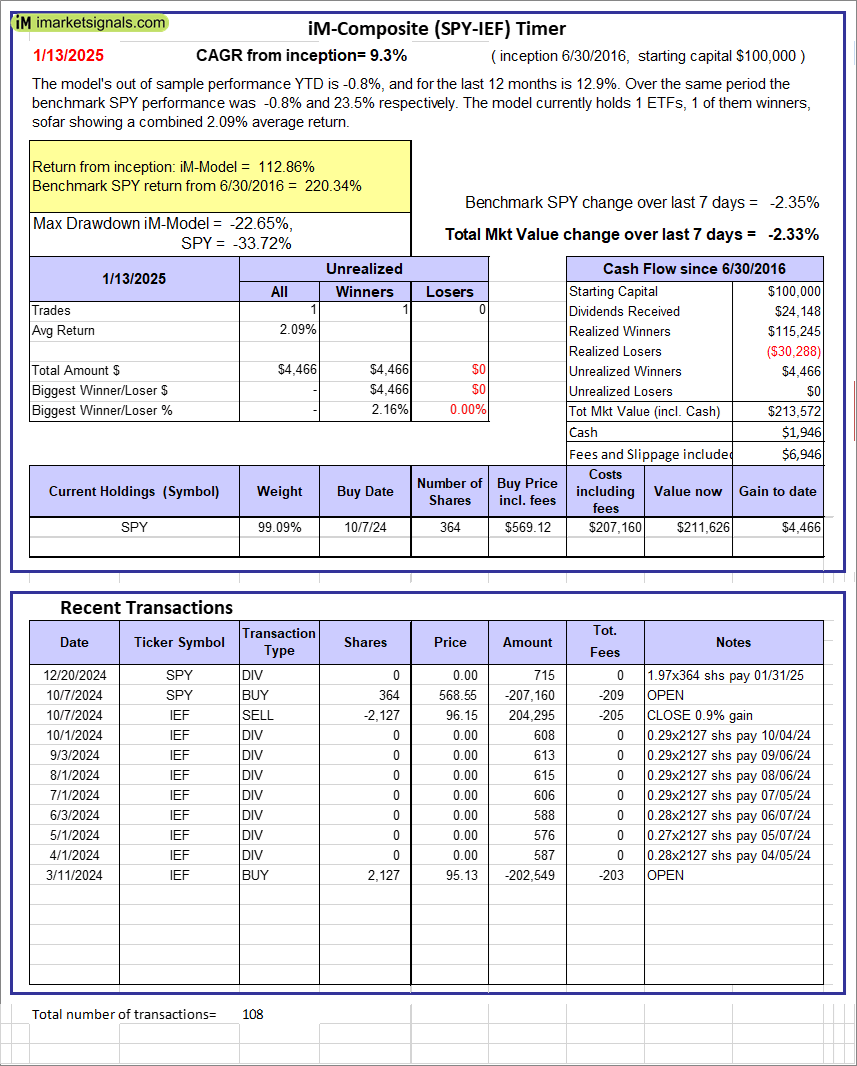 iM-Composite (SPY-IEF) Timer: The model’s out of sample performance YTD is -0.8%, and for the last 12 months is 12.9%. Over the same period the benchmark SPY performance was -0.8% and 23.5% respectively. Over the previous week the market value of the iM-Composite (SPY-IEF) Timer gained -2.33% at a time when SPY gained -2.35%. A starting capital of $100,000 at inception on 6/30/2016 would have grown to $213,572 which includes $1,946 cash and excludes $6,946 spent on fees and slippage. |