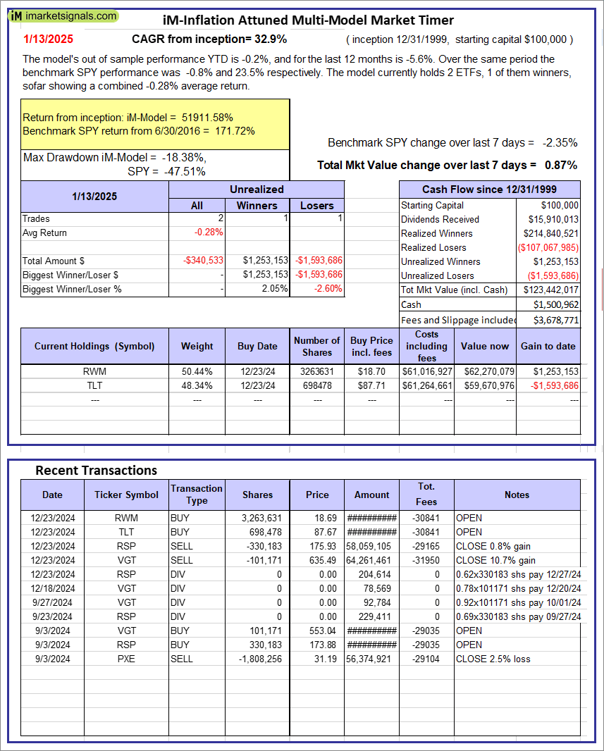 iM-Inflation Attuned Multi-Model Market Timer: The model’s out of sample performance YTD is -0.2%, and for the last 12 months is -5.6%. Over the same period the benchmark SPY performance was -0.8% and 23.5% respectively. Over the previous week the market value of the iM-Inflation Attuned Multi-Model Market Timer gained 0.87% at a time when SPY gained -2.35%. A starting capital of $100,000 at inception on 3/24/2017 would have grown to $123,442,017 which includes $1,500,962 cash and excludes $3,678,771 spent on fees and slippage. |