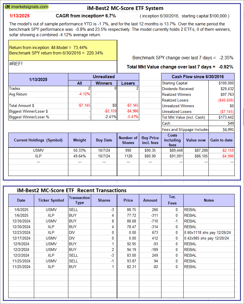 iM-Best2 MC-Score ETF System: The model’s out of sample performance YTD is -1.7%, and for the last 12 months is 13.7%. Over the same period the benchmark SPY performance was -0.8% and 23.5% respectively. Over the previous week the market value of the iM-Best2 MC-Score ETF System gained -0.92% at a time when SPY gained -2.35%. A starting capital of $100,000 at inception on 6/30/2016 would have grown to $173,442 which includes $49 cash and excludes $4,991 spent on fees and slippage. |