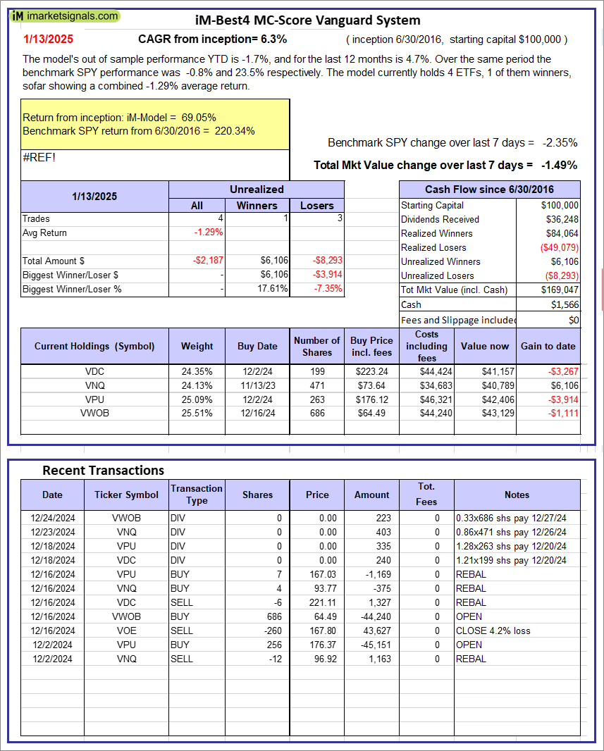 iM-Best4 MC-Score Vanguard System: The model’s out of sample performance YTD is -1.7%, and for the last 12 months is 4.7%. Over the same period the benchmark SPY performance was -0.8% and 23.5% respectively. Over the previous week the market value of the iM-Best4 MC-Score Vanguard System gained -1.49% at a time when SPY gained -2.35%. A starting capital of $100,000 at inception on 6/30/2016 would have grown to $169,047 which includes $1,566 cash and excludes $00 spent on fees and slippage. |