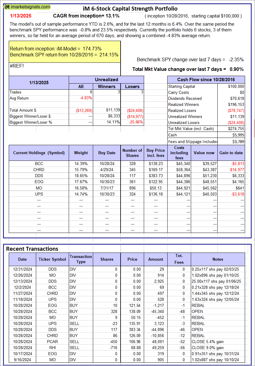 iM 6-Stock Capital Strength Portfolio: The model’s out of sample performance YTD is 2.6%, and for the last 12 months is 6.4%. Over the same period the benchmark SPY performance was -0.8% and 23.5% respectively. Over the previous week the market value of the iM 6-Stock Capital Strength Portfolio gained 0.90% at a time when SPY gained -2.35%. A starting capital of $100,000 at inception on 10/28/2016 would have grown to $274,755 which includes $5,995 cash and excludes $3,789 spent on fees and slippage. |