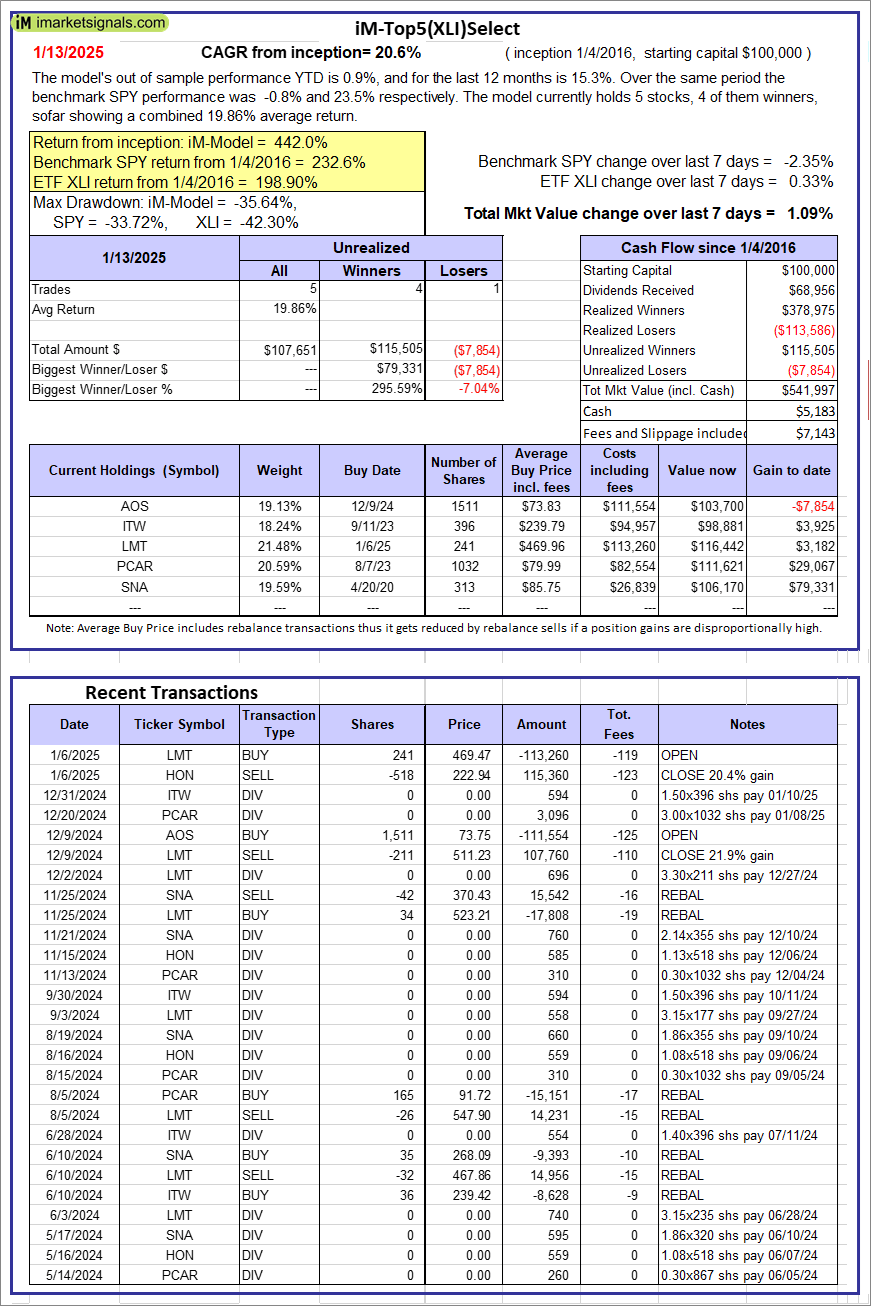 iM-Top5(XLI)Select: Since inception, on 1/5/2016, the model gained 442.00% while the benchmark SPY gained 232.57% over the same period. Over the previous week the market value of iM-Top5(XLI)Select gained 1.09% at a time when SPY gained -2.35%. A starting capital of $100,000 at inception on 1/5/2016 would have grown to $541,997 which includes $5,183 cash and excludes $7,143 spent on fees and slippage. |