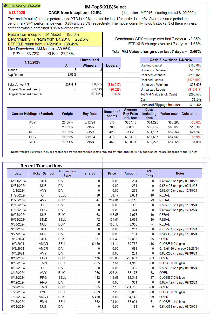 iM-Top5(XLB)Select: Since inception, on 1/5/2016, the model gained 190.58% while the benchmark SPY gained 232.57% over the same period. Over the previous week the market value of iM-Top5(XLB)Select gained 2.46% at a time when SPY gained -2.35%. A starting capital of $100,000 at inception on 1/5/2016 would have grown to $290,578 which includes $1,149 cash and excludes $14,365 spent on fees and slippage. |