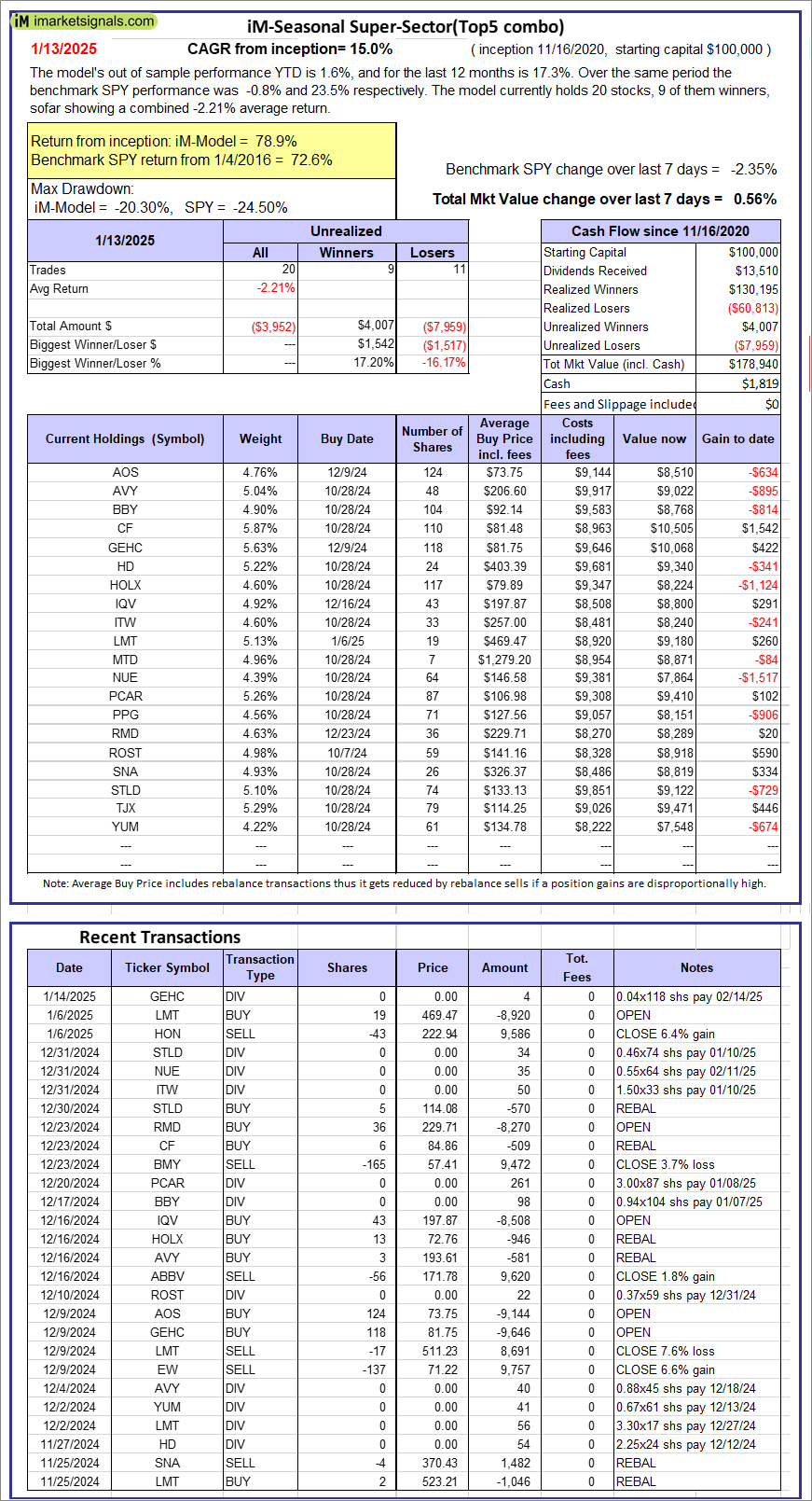 iM-Seasonal Super-Sectors (Top5 combo) : Since inception, on 11/17/2020, the model gained 78.94% while the benchmark SPY gained 72.64% over the same period. Over the previous week the market value of iM-Seasonal Super-Sectors (Top5 combo) gained 0.56% at a time when SPY gained -2.35%. A starting capital of $100,000 at inception on 11/17/2020 would have grown to $178,940 which includes $1,819 cash and excludes $00 spent on fees and slippage. |