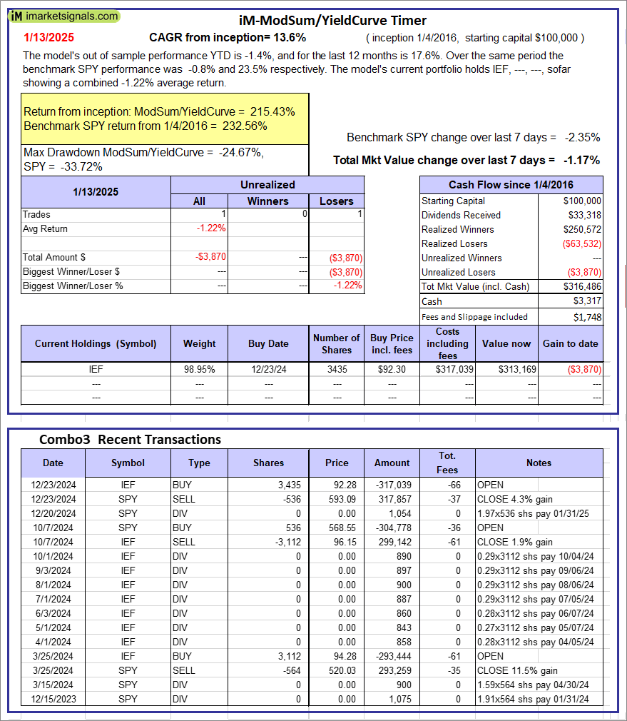 iM-ModSum/YieldCurve Timer: The model’s out of sample performance YTD is -1.4%, and for the last 12 months is 17.6%. Over the same period the benchmark SPY performance was -0.8% and 23.5% respectively. Over the previous week the market value of iM-PortSum/YieldCurve Timer gained -1.17% at a time when SPY gained -2.35%. A starting capital of $100,000 at inception on 1/1/2016 would have grown to $316,486 which includes $3,317 cash and excludes $1,748 spent on fees and slippage. |