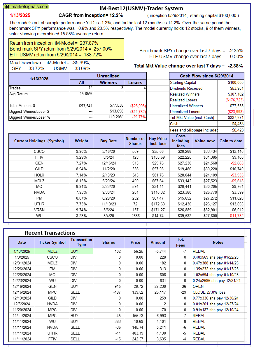 iM-Best12(USMV)-Trader: The model’s out of sample performance YTD is -1.2%, and for the last 12 months is 14.2%. Over the same period the benchmark SPY performance was -0.8% and 23.5% respectively. Since inception, on 6/30/2014, the model gained 237.87% while the benchmark SPY gained 257.00% and the ETF USMV gained 188.72% over the same period. Over the previous week the market value of iM-Best12(USMV)-Trader gained -2.38% at a time when SPY gained -2.35%. A starting capital of $100,000 at inception on 6/30/2014 would have grown to $337,871 which includes -$4,453 cash and excludes $8,423 spent on fees and slippage. |