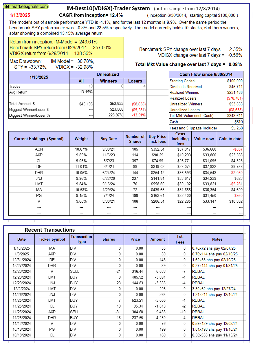 iM-Best10(VDIGX)-Trader: The model’s out of sample performance YTD is -1.1%, and for the last 12 months is 8.9%. Over the same period the benchmark SPY performance was -0.8% and 23.5% respectively. Since inception, on 7/1/2014, the model gained 243.61% while the benchmark SPY gained 257.00% and VDIGX gained 138.56% over the same period. Over the previous week the market value of iM-Best10(VDIGX) gained 0.08% at a time when SPY gained -2.35%. A starting capital of $100,000 at inception on 7/1/2014 would have grown to $343,611 which includes $610 cash and excludes $5,258 spent on fees and slippage. |