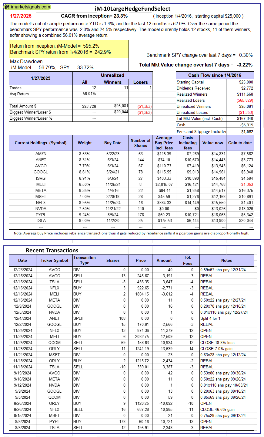 iM-10LargeHedgeFundSelect: Since inception, on 1/5/2016, the model gained 595.15% while the benchmark SPY gained 242.86% over the same period. Over the previous week the market value of iM-10LargeHedgeFundSelect gained -3.22% at a time when SPY gained 0.30%. A starting capital of $25,000 at inception on 1/5/2016 would have grown to $167,340 which includes -$5,915 cash and excludes $1,682 spent on fees and slippage. |