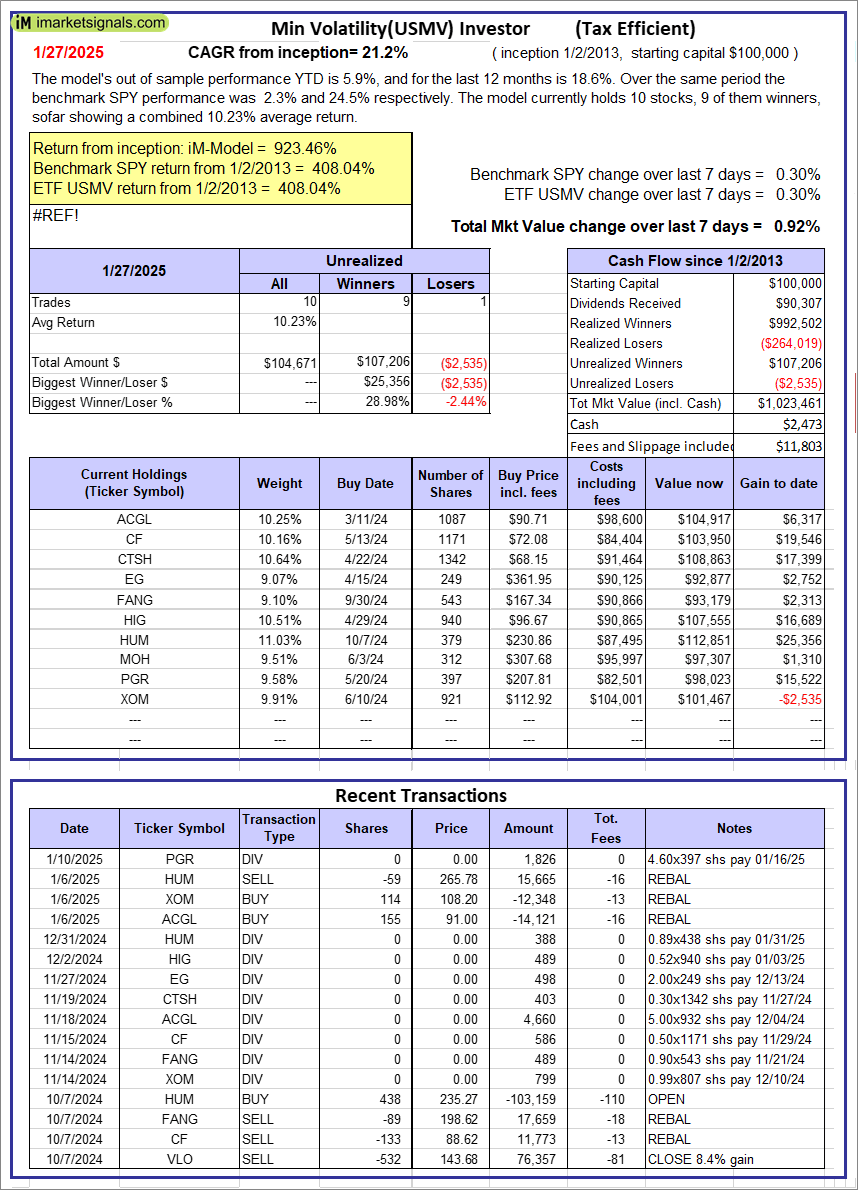 iM-Min Volatility(USMV) Investor (Tax Efficient): The model’s out of sample performance YTD is 5.9%, and for the last 12 months is 18.6%. Over the same period the benchmark SPY performance was 2.3% and 24.5% respectively. Since inception, on 1/3/2013, the model gained 923.46% while the benchmark SPY gained 408.04% and the ETF USMV gained 408.04% over the same period. Over the previous week the market value of iM-Best12(USMV)Q1 gained 0.92% at a time when SPY gained 0.30%. A starting capital of $100,000 at inception on 1/3/2013 would have grown to $1,023,461 which includes $2,473 cash and excludes $11,803 spent on fees and slippage. |