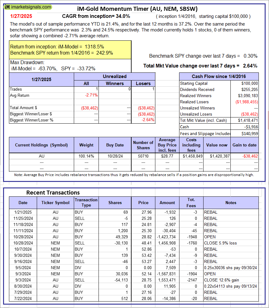 iM-Gold Momentum Timer (AU, NEM, SBSW): The model’s out of sample performance YTD is 21.4%, and for the last 12 months is 37.2%. Over the same period the benchmark SPY performance was 2.3% and 24.5% respectively. Over the previous week the market value of iM-Gold Momentum Timer (AU, NEM, SBSW) gained 2.64% at a time when SPY gained 0.30%. A starting capital of $100,000 at inception on 6/30/2016 would have grown to -$1,916 which includes $140,959 cash and excludes Gain to date spent on fees and slippage. |