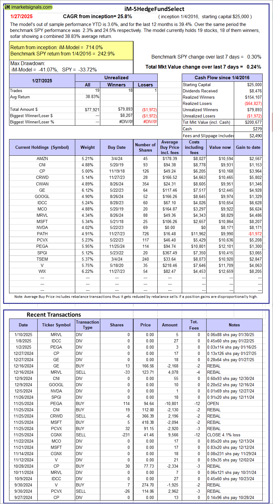 iM-5HedgeFundSelect: Since inception, on 1/5/2016, the model gained 714.00% while the benchmark SPY gained 242.86% over the same period. Over the previous week the market value of iM-5HedgeFundSelect gained 0.24% at a time when SPY gained 0.30%. A starting capital of $25,000 at inception on 1/5/2016 would have grown to $200,677 which includes $279 cash and excludes $2,490 spent on fees and slippage. |