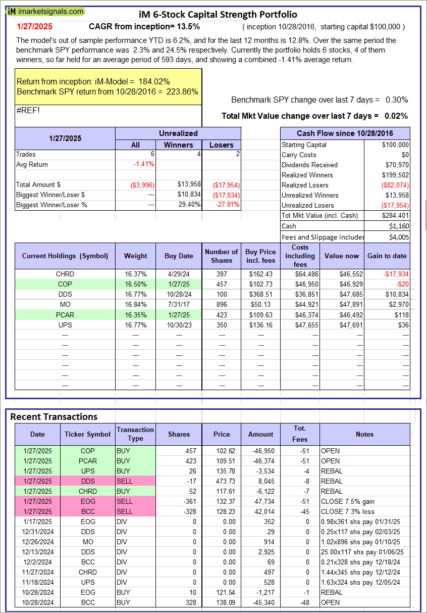 iM 6-Stock Capital Strength Portfolio: The model’s out of sample performance YTD is 6.2%, and for the last 12 months is 12.8%. Over the same period the benchmark SPY performance was 2.3% and 24.5% respectively. Over the previous week the market value of the iM 6-Stock Capital Strength Portfolio gained 0.02% at a time when SPY gained 0.30%. A starting capital of $100,000 at inception on 10/28/2016 would have grown to $284,401 which includes $1,160 cash and excludes $4,005 spent on fees and slippage. |