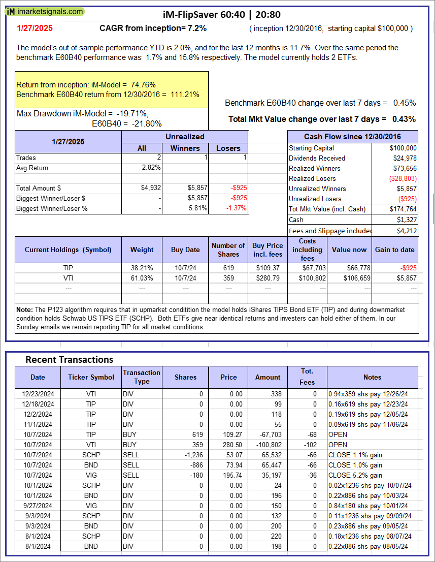 iM-FlipSaver 60:40 | 20:80 – 2017: The model’s out of sample performance YTD is 2.0%, and for the last 12 months is 11.7%. Over the same period the benchmark E60B40 performance was 1.7% and 15.8% respectively. Over the previous week the market value of iM-FlipSaver 80:20 | 20:80 gained 0.43% at a time when SPY gained 0.45%. A starting capital of $100,000 at inception on 7/16/2015 would have grown to $174,764 which includes $1,327 cash and excludes $4,212 spent on fees and slippage. |