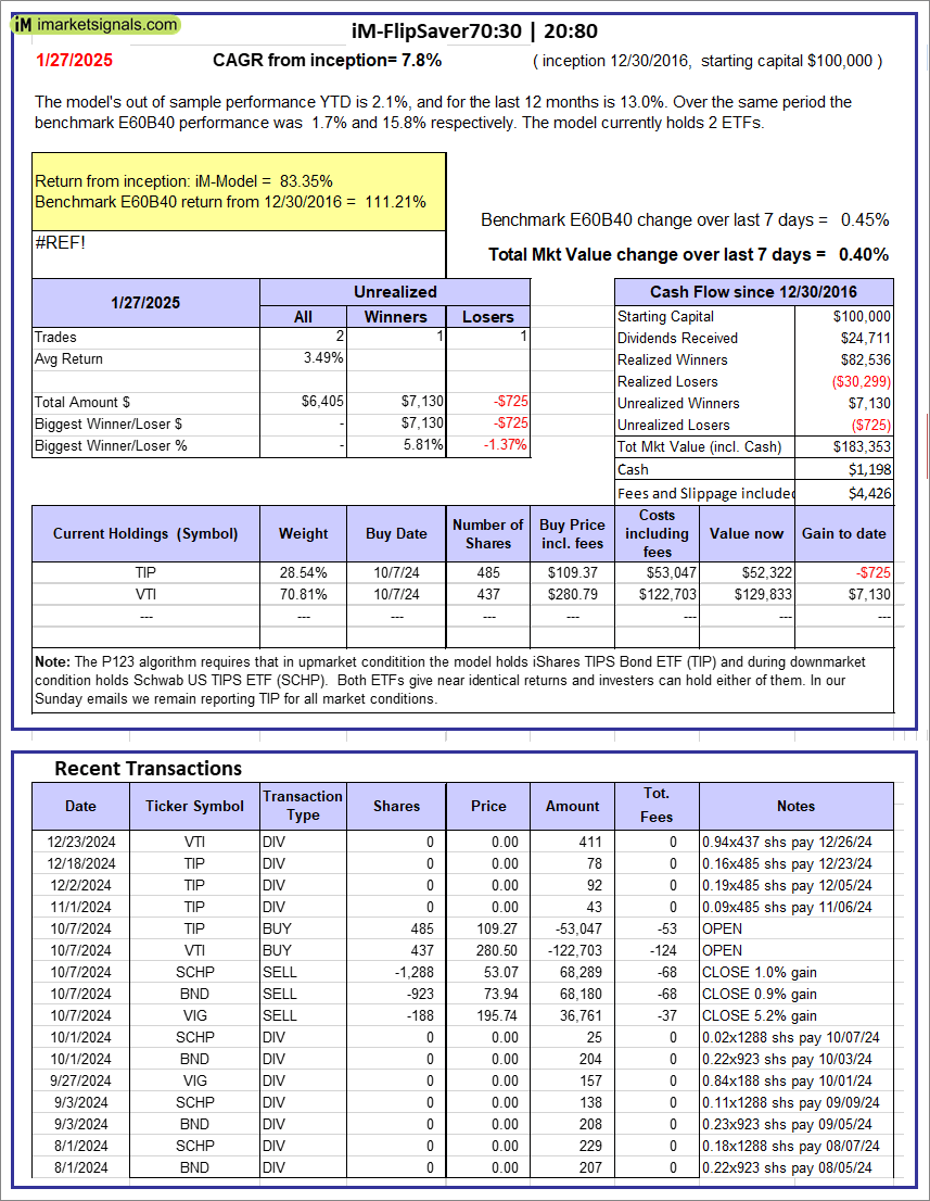 iM-FlipSaver 70:30 | 20:80 – 2017: The model’s out of sample performance YTD is 2.1%, and for the last 12 months is 13.0%. Over the same period the benchmark E60B40 performance was 1.7% and 15.8% respectively. Over the previous week the market value of iM-FlipSaver 70:30 | 20:80 gained 0.40% at a time when SPY gained 0.45%. A starting capital of $100,000 at inception on 7/15/2015 would have grown to $183,353 which includes $1,198 cash and excludes $4,426 spent on fees and slippage. |