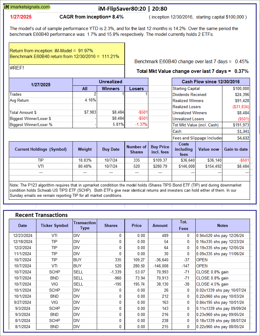 iM-FlipSaver 80:20 | 20:80 – 2017: The model’s out of sample performance YTD is 2.3%, and for the last 12 months is 14.2%. Over the same period the benchmark E60B40 performance was 1.7% and 15.8% respectively. Over the previous week the market value of iM-FlipSaver 80:20 | 20:80 gained 0.37% at a time when SPY gained 0.45%. A starting capital of $100,000 at inception on 1/2/2017 would have grown to $191,973 which includes $1,341 cash and excludes $4,632 spent on fees and slippage. |