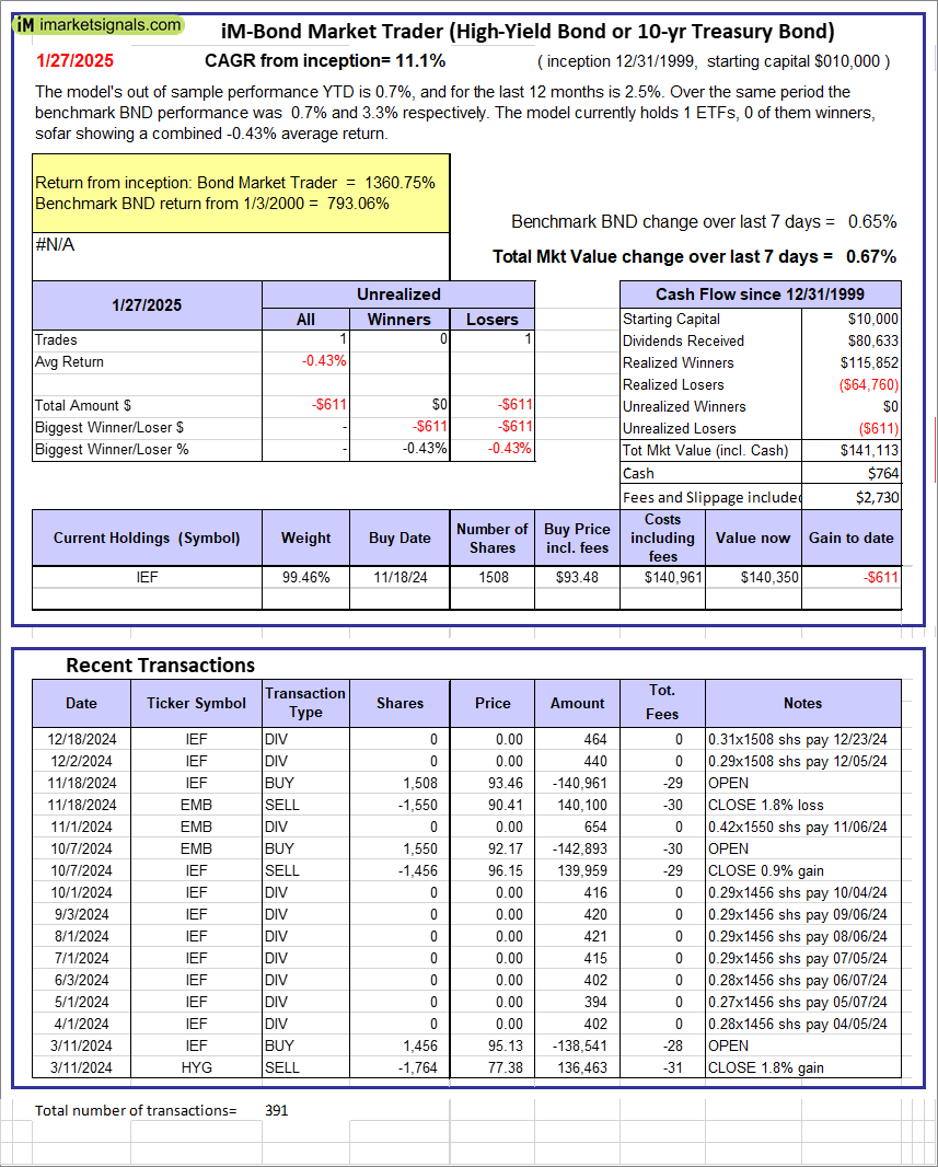 iM-Bond Market Trader (High-Yield Bond or 10-yr Treasury Bond): The model’s out of sample performance YTD is 0.7%, and for the last 12 months is 2.5%. Over the same period the benchmark BND performance was 0.7% and 3.3% respectively. Over the previous week the market value of the iM-Bond Market Trader (High-Yield Bond or 10-yr Treasury Bond) gained 0.67% at a time when BND gained 0.65%. A starting capital of $10,000 at inception on 1/3/2000 would have grown to $141,113 which includes $764 cash and excludes $2,730 spent on fees and slippage. |
