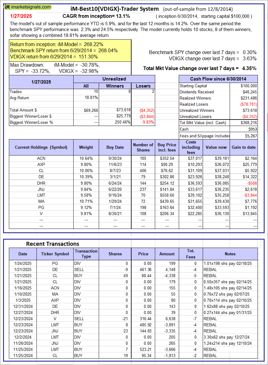 iM-Best10(VDIGX)-Trader: The model’s out of sample performance YTD is 5.9%, and for the last 12 months is 14.2%. Over the same period the benchmark SPY performance was 2.3% and 24.5% respectively. Since inception, on 7/1/2014, the model gained 268.22% while the benchmark SPY gained 268.04% and VDIGX gained 151.30% over the same period. Over the previous week the market value of iM-Best10(VDIGX) gained 4.35% at a time when SPY gained 0.30%. A starting capital of $100,000 at inception on 7/1/2014 would have grown to $368,216 which includes $953 cash and excludes $5,267 spent on fees and slippage. |