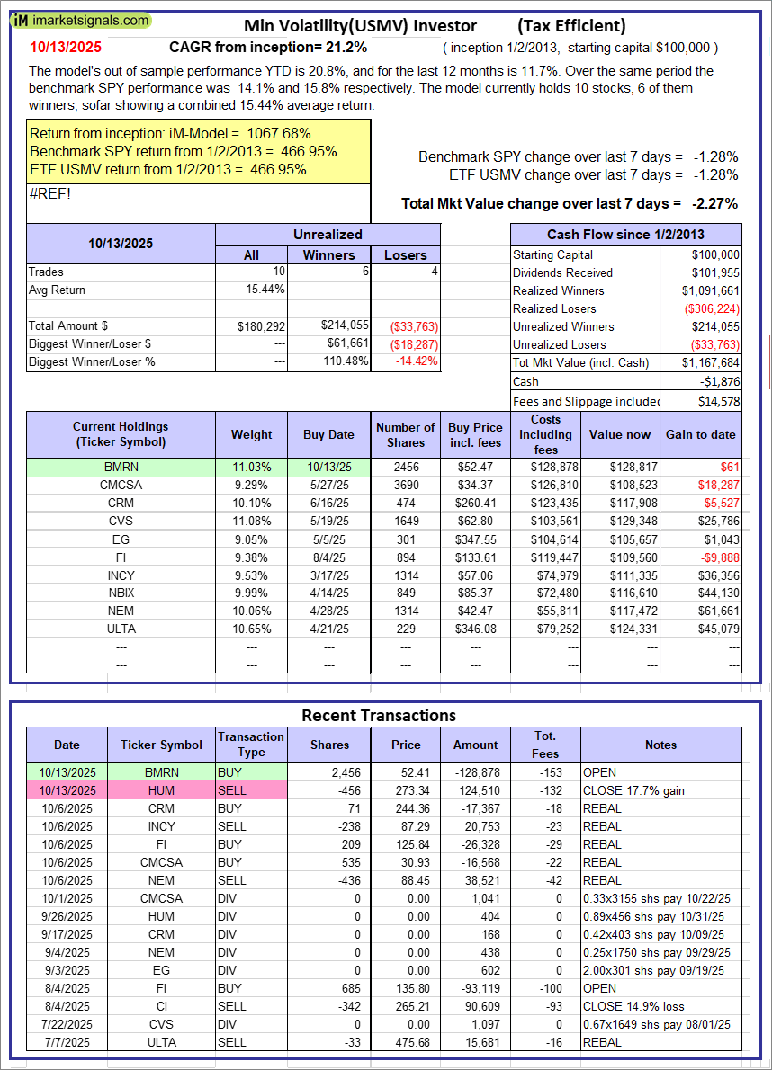 iM-Min Volatility(USMV) Investor (Tax Efficient): The model’s out of sample performance YTD is 20.8%, and for the last 12 months is 11.7%. Over the same period the benchmark SPY performance was 14.1% and 15.8% respectively. Since inception, on 1/3/2013, the model gained 1067.68% while the benchmark SPY gained 466.95% and the ETF USMV gained 466.95% over the same period. Over the previous week the market value of iM-Best12(USMV)Q1 gained -2.27% at a time when SPY gained -1.28%. A starting capital of $100,000 at inception on 1/3/2013 would have grown to $1,167,684 which includes -$1,876 cash and excludes $14,578 spent on fees and slippage. |