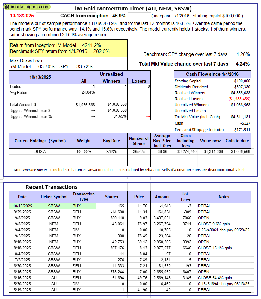 iM-Gold Momentum Timer (AU, NEM, SBSW): The model’s out of sample performance YTD is 268.9%, and for the last 12 months is 163.5%. Over the same period the benchmark SPY performance was 14.1% and 15.8% respectively. Over the previous week the market value of iM-Gold Momentum Timer (AU, NEM, SBSW) gained 4.24% at a time when SPY gained -1.28%. A starting capital of $100,000 at inception on 6/30/2016 would have grown to -$127 which includes $171,911 cash and excludes Gain to date spent on fees and slippage. |