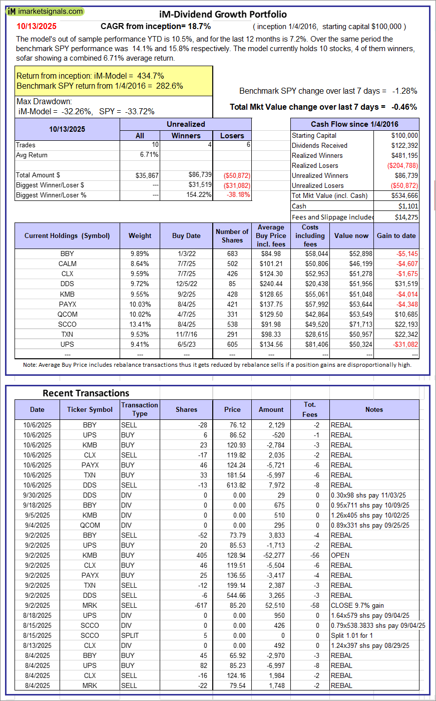 iM-Dividend Growth Portfolio: The model’s out of sample performance YTD is 10.5%, and for the last 12 months is 7.2%. Over the same period the benchmark SPY performance was 14.1% and 15.8% respectively. Over the previous week the market value of the iM-Dividend Growth Portfolio gained -0.46% at a time when SPY gained -1.28%. A starting capital of $100,000 at inception on 6/30/2016 would have grown to $534,666 which includes $1,101 cash and excludes $14,275 spent on fees and slippage. |