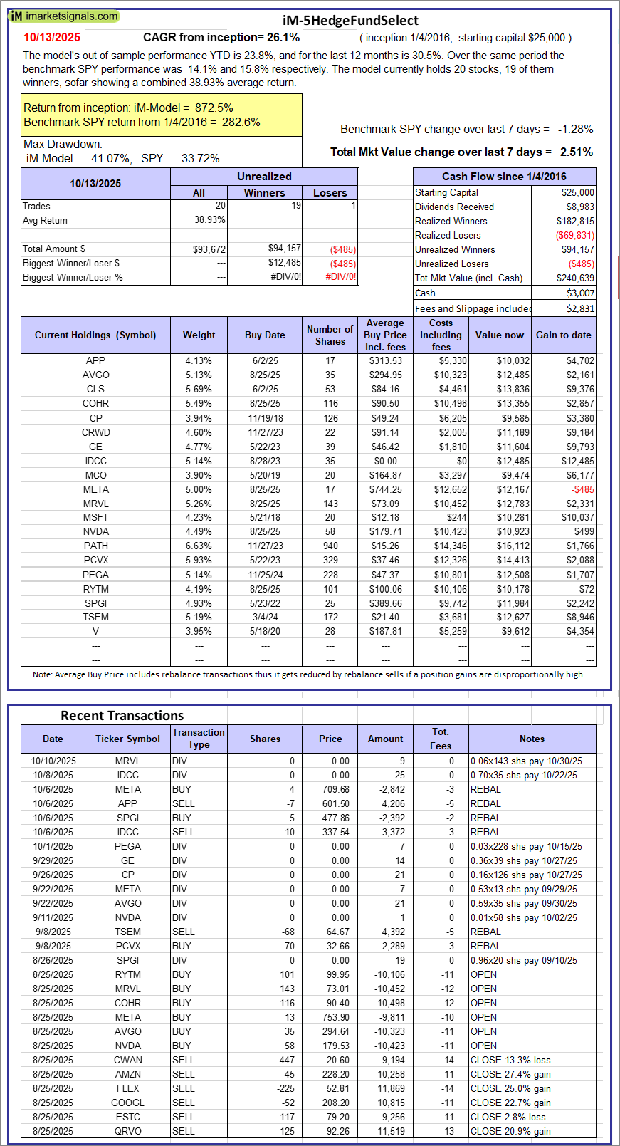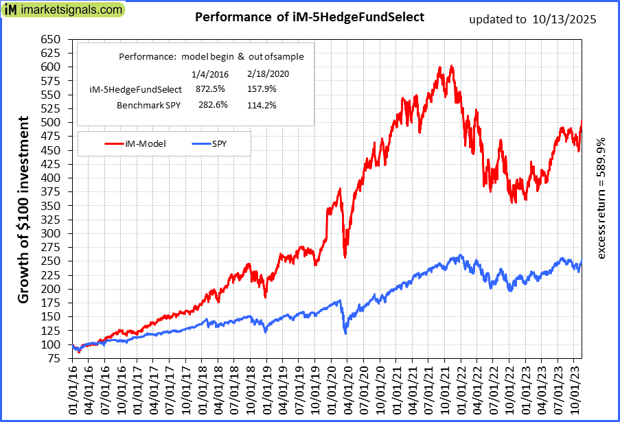 iM-5HedgeFundSelect: Since inception, on 1/5/2016, the model gained 872.54% while the benchmark SPY gained 282.60% over the same period. Over the previous week the market value of iM-5HedgeFundSelect gained 2.51% at a time when SPY gained -1.28%. A starting capital of $25,000 at inception on 1/5/2016 would have grown to $240,639 which includes $3,007 cash and excludes $2,831 spent on fees and slippage. |