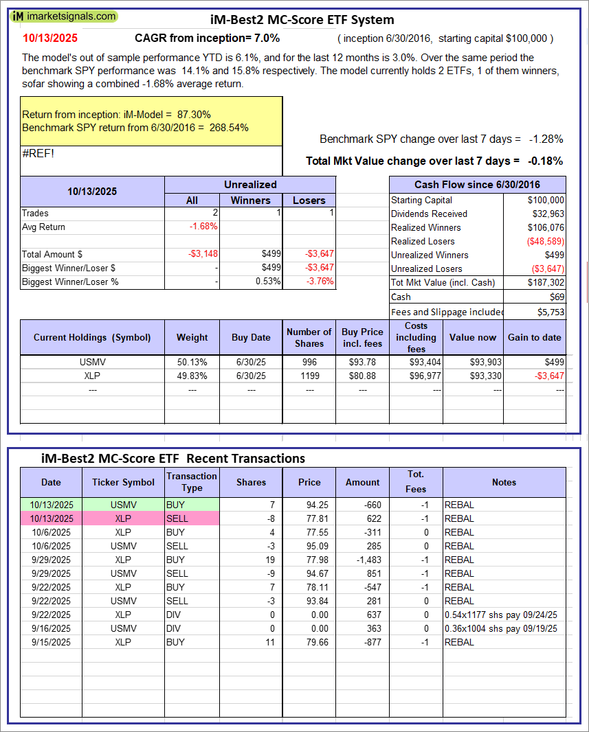 iM-Best2 MC-Score ETF System: The model’s out of sample performance YTD is 6.1%, and for the last 12 months is 3.0%. Over the same period the benchmark SPY performance was 14.1% and 15.8% respectively. Over the previous week the market value of the iM-Best2 MC-Score ETF System gained -0.18% at a time when SPY gained -1.28%. A starting capital of $100,000 at inception on 6/30/2016 would have grown to $187,302 which includes $69 cash and excludes $5,753 spent on fees and slippage. |