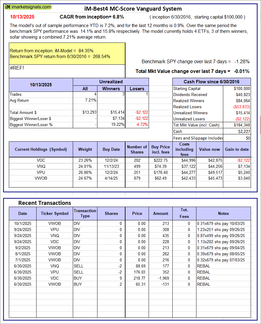 iM-Best4 MC-Score Vanguard System: The model’s out of sample performance YTD is 7.2%, and for the last 12 months is 0.9%. Over the same period the benchmark SPY performance was 14.1% and 15.8% respectively. Over the previous week the market value of the iM-Best4 MC-Score Vanguard System gained -0.01% at a time when SPY gained -1.28%. A starting capital of $100,000 at inception on 6/30/2016 would have grown to $184,348 which includes $2,227 cash and excludes $00 spent on fees and slippage. |