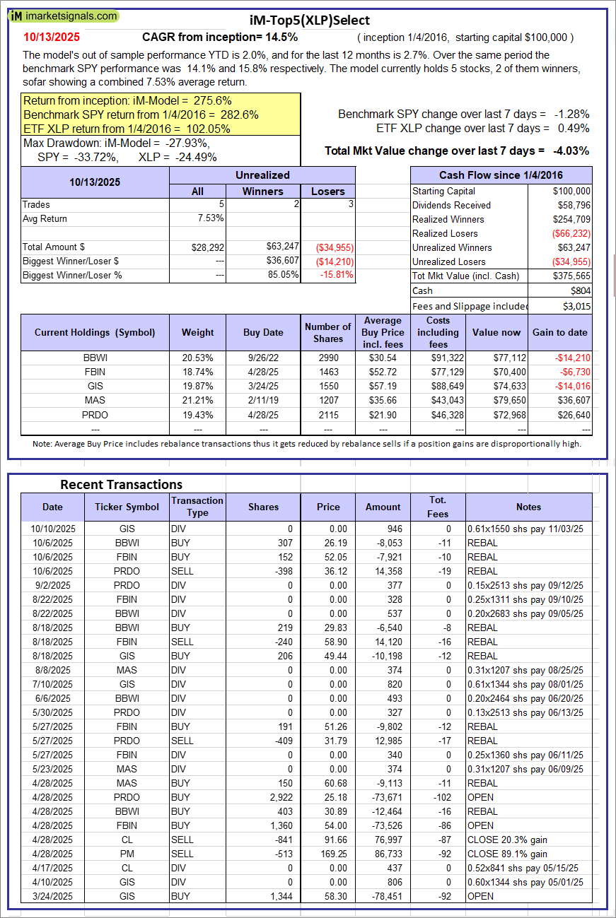 iM-Top5(XLP)Select: Since inception, on 1/5/2016, the model gained 275.57% while the benchmark SPY gained 282.60% over the same period. Over the previous week the market value of iM-Top5(XLP)Select gained -4.03% at a time when SPY gained -1.28%. A starting capital of $100,000 at inception on 1/5/2016 would have grown to $375,565 which includes $804 cash and excludes $3,015 spent on fees and slippage. |