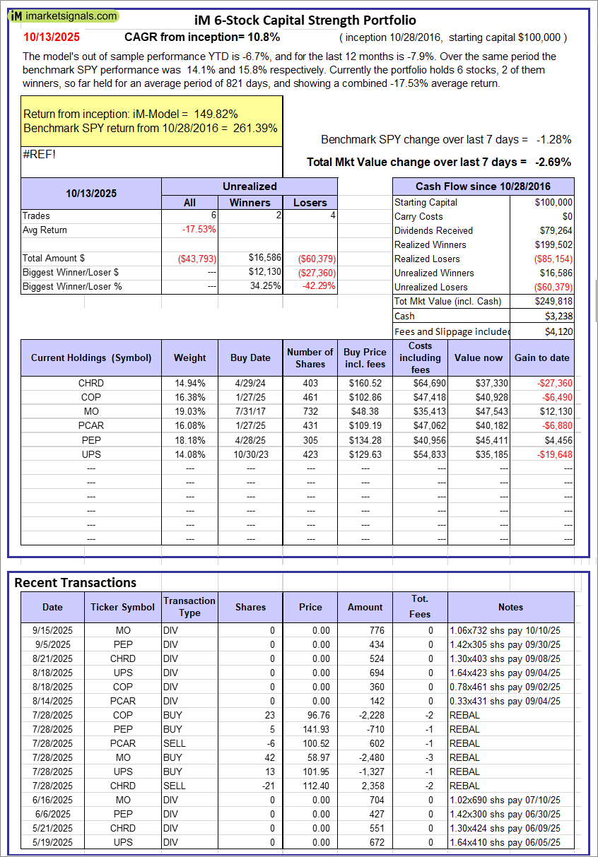 iM 6-Stock Capital Strength Portfolio: The model’s out of sample performance YTD is -6.7%, and for the last 12 months is -7.9%. Over the same period the benchmark SPY performance was 14.1% and 15.8% respectively. Over the previous week the market value of the iM 6-Stock Capital Strength Portfolio gained -2.69% at a time when SPY gained -1.28%. A starting capital of $100,000 at inception on 10/28/2016 would have grown to $249,818 which includes $3,238 cash and excludes $4,120 spent on fees and slippage. |