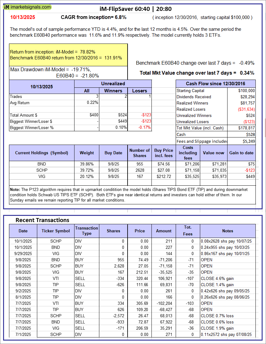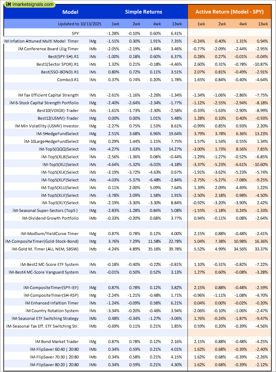 iM-Composite(Gold-Stocks-Bond) Timer: The model’s out of sample performance YTD is 56.3%, and for the last 12 months is 54.2%. Over the same period the benchmark SPY performance was 14.1% and 15.8% respectively. Over the previous week the market value of the iM-Composite(Gold-Stocks-Bond) Timer gained 3.76% at a time when SPY gained -1.28%. A starting capital of $100,000 at inception on 6/30/2016 would have grown to $385,216 which includes $36 cash and excludes $9,190 spent on fees and slippage. |