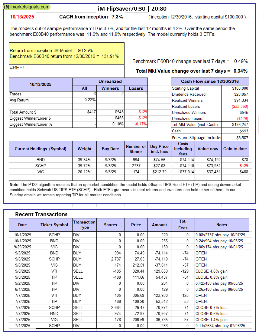 iM-FlipSaver 70:30 | 20:80 – 2017: The model’s out of sample performance YTD is 3.7%, and for the last 12 months is 4.2%. Over the same period the benchmark E60B40 performance was 11.6% and 11.9% respectively. Over the previous week the market value of iM-FlipSaver 70:30 | 20:80 gained 0.34% at a time when SPY gained -0.49%. A starting capital of $100,000 at inception on 7/15/2015 would have grown to $186,247 which includes $593 cash and excludes $5,507 spent on fees and slippage. |
