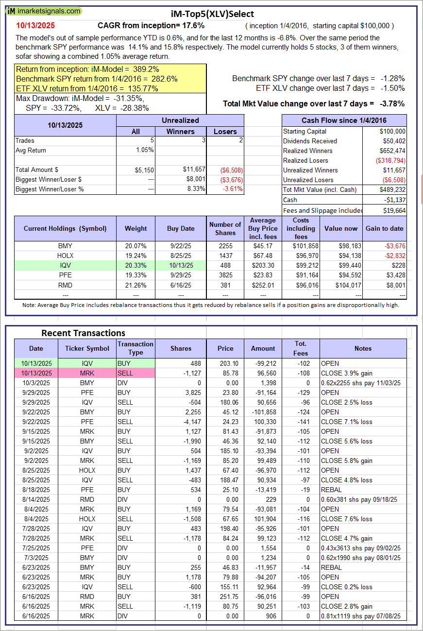iM-Top5(XLV)Select: Since inception, on 1/5/2016, the model gained 389.23% while the benchmark SPY gained 282.60% over the same period. Over the previous week the market value of iM-Top5(XLV)Select gained -3.78% at a time when SPY gained -1.28%. A starting capital of $100,000 at inception on 1/5/2016 would have grown to $489,232 which includes -$1,137 cash and excludes $19,664 spent on fees and slippage. |